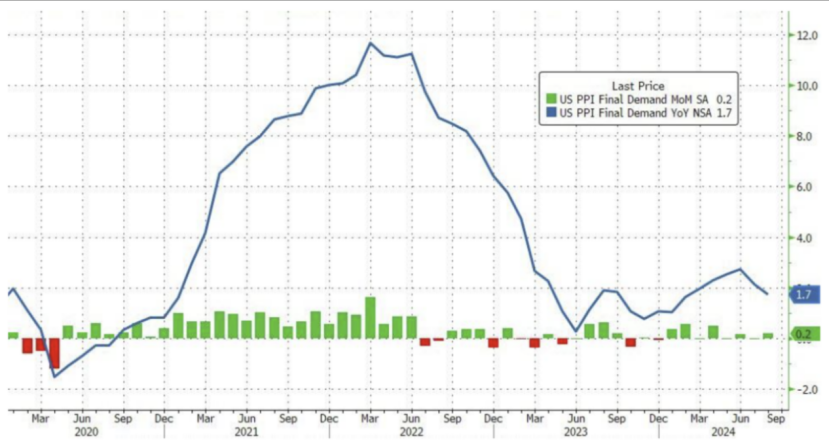 北京时间9月12日晚间,美国劳工部公布的数据显示,美国8月PPI同比增长1.7%,为自2月以来最低;环比增长0.2%,高于预期的0.1%;8月核心PPI同比增长2.4%,符合预期,与前值保持一致;环比增0.3%,高于预期;8月最终需求服务价格涨0.4%,7月跌0.3%,