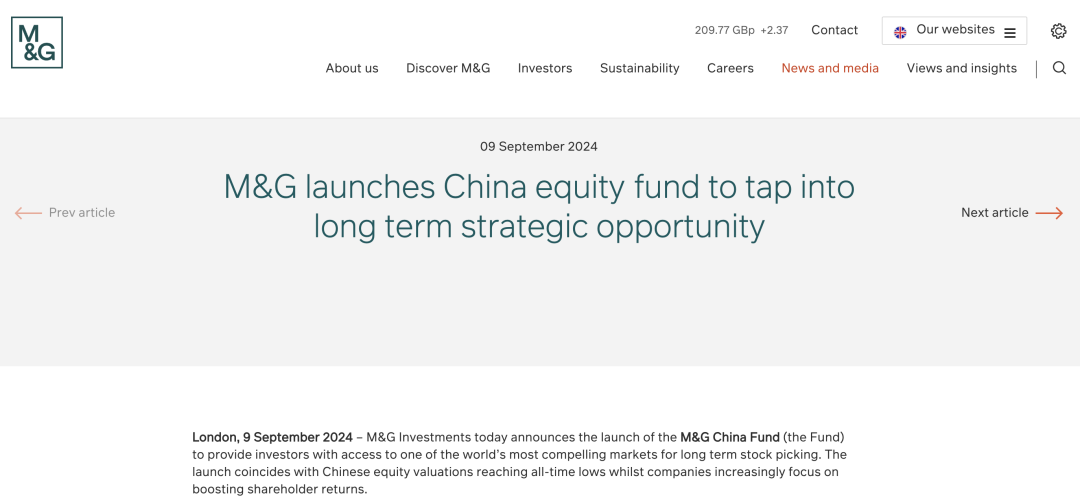 近日,英国资产管理巨头M&G投资公司宣布推出中国股票基金,看好中国是“全球最具吸引力的长期股票投资市场之一”。M&G表示,该基金的推出正值中国股市处于估值底部区间,同时许多公司日益关注提升股东回报。