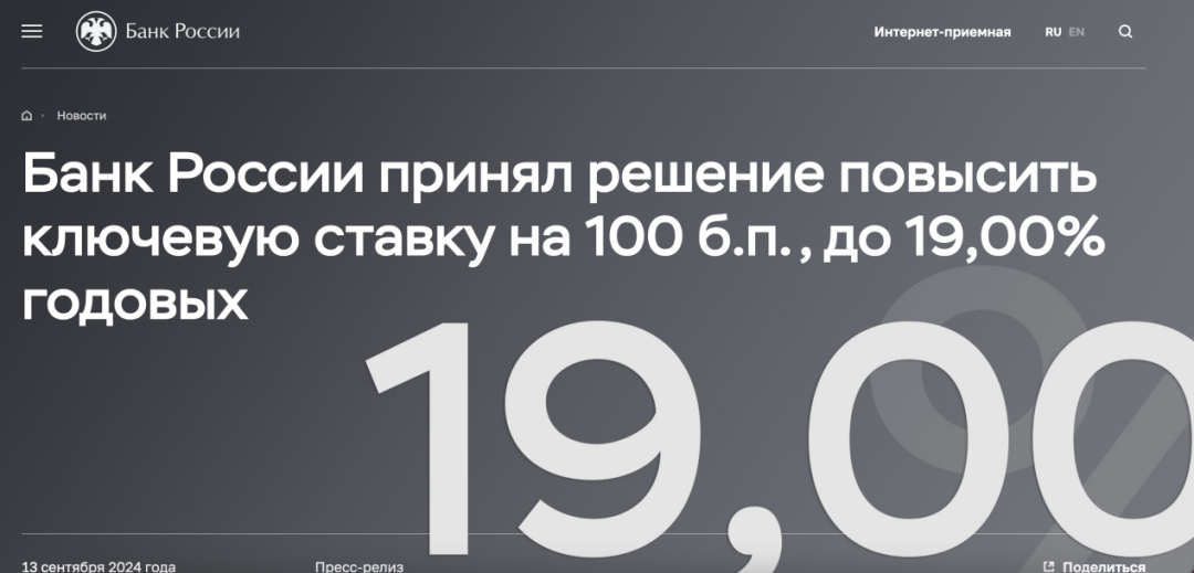 9月13日,俄罗斯央行宣布,加息100个基点,将基准利率上调至19.00%,市场预估为18.00%。