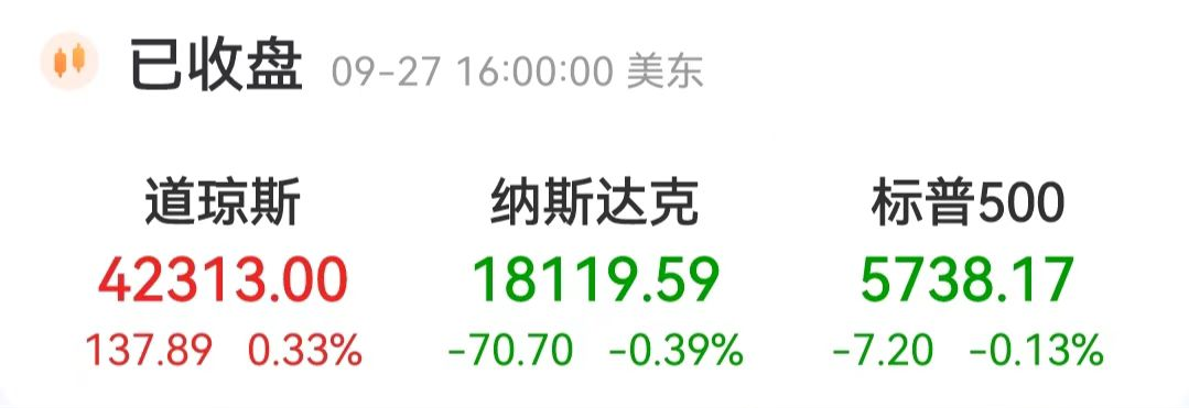 当地时间9月27日,美股三大指数收盘涨跌不一。道指收涨137.89点,涨幅为0.33%,报42313.00点;纳指跌70.70点,跌幅为0.39%,报18119.59点;标普500指数跌7.20点,跌幅为0.13%,报5738.17点。