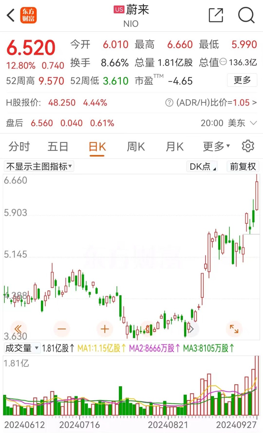 个股方面,蔚来周五当地时间收盘领涨中概股,收盘大涨近13%,9月以来涨幅超60%。