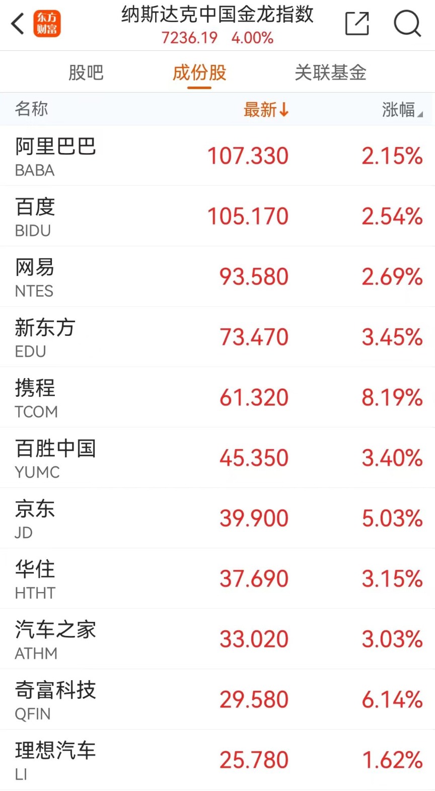 热门中概股普涨,纳斯达克中国金龙指数涨4%,本周累计上涨23.94%。个股方面,蔚来涨近13%,小鹏汽车涨9%,哔哩哔哩涨超8%,爱奇艺、富途控股、京东涨超5%,拼多多涨超4%,新东方涨超3%,网易、百度、阿里巴巴涨超2%,理想汽车、贝壳涨超1%,腾讯音乐小幅上涨。