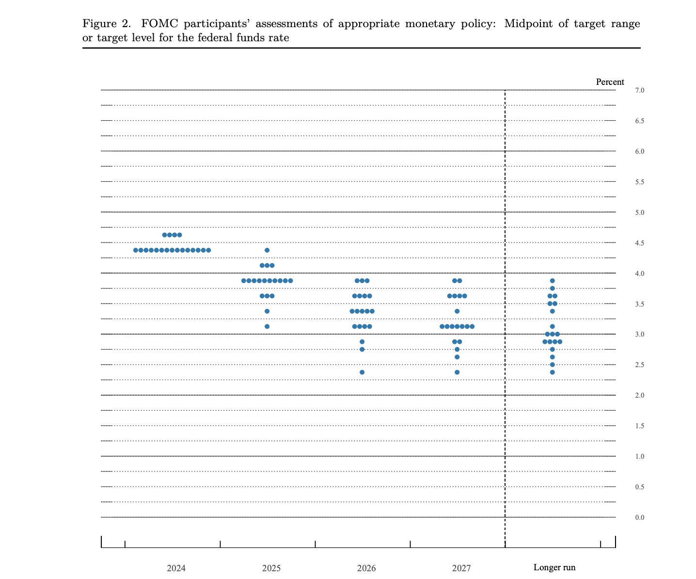美联储预计2025年将仅降息2次,而非9月会议预测的4次。最新公布的利率点阵图则显示,委员们对2025年的利率预测中位数由3.4%上调至3.9%, 将2026年底利率中位数由2.9%上调至3.4%,长期中性利率则由2.9%上调至3.0%。