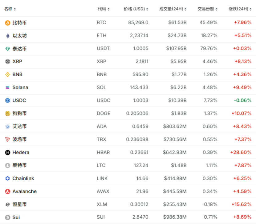 3月1日,加密货币集体拉升,比特币大涨近8%,以太坊涨超5%,艾达币涨超8%,Solana涨超9%,狗狗币涨超10%,Hedera更是飙涨超28%。