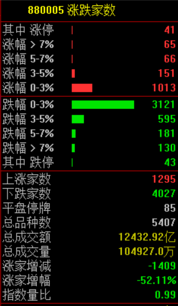 两市共1295只个股上涨,41只个股涨停,4027只个股下跌。