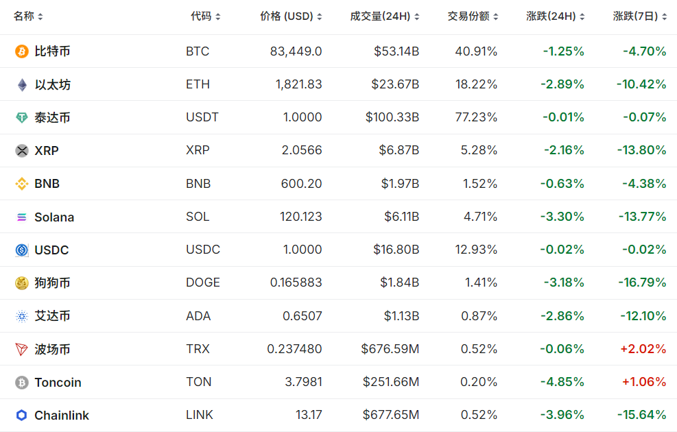 过去7个交易日的时间,比特币跌幅接近5%,以太坊跌超10%,艾达币跌超12%。Solana、XRP跌超13%,狗狗币跌超16%。上述币种的集体下跌,意味着数字货币正承受着巨大的抛售压力,反映出投资者对贸易紧张局势以及关税对经济的更广泛影响的强烈担忧。