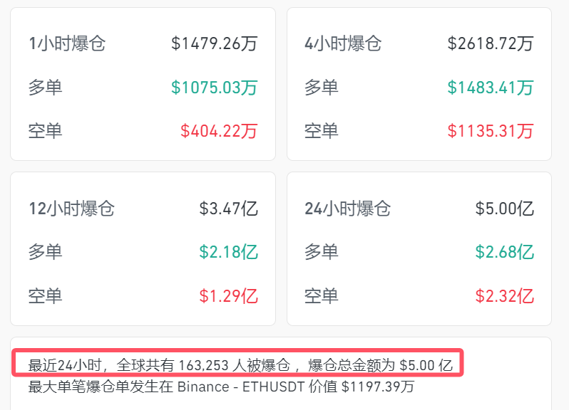 其中,比特币在盘中跳水超4000美元,价格从8.69万美元跌至8.21万美元;以太坊则从1950美元杀跌至1790美元。XRP、Solana、艾达币等其他加密货币也跟随跳水。Coinglass数据显示,过去24小时内,加密货币市场全网合约爆仓金额达到5亿美元,爆仓人数超过16万人。