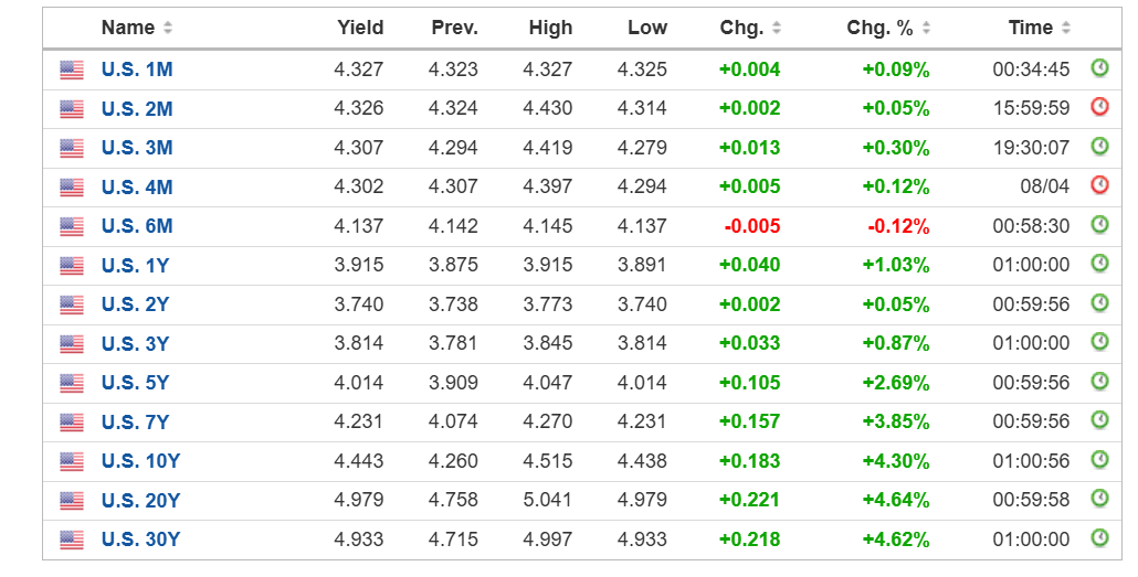 美国国债连续第三天大幅杀跌,美国10年期国债收益率今天一度逼近4.5%。其他期限国债收益率亦大幅飙升。这意味着,美国国债正在被抛弃。