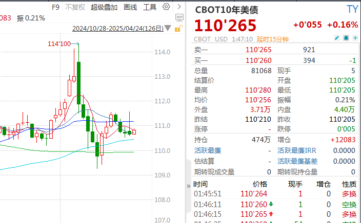 10年期美国国债期货的价格4月11日一度跌至109.08,目前已回升至110.625。