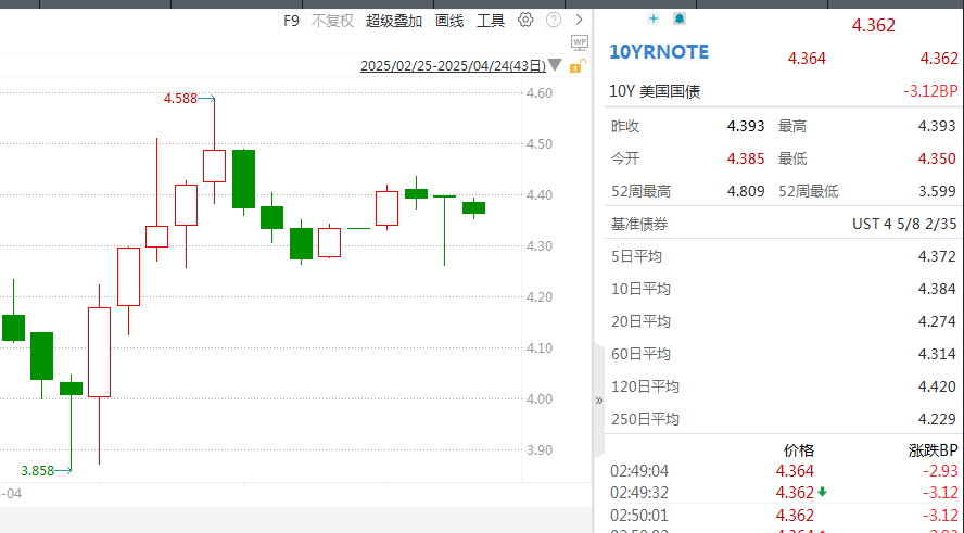 以10年期美债利率为例,今年4月7日至4月11日,10年期美债收益率自3.86%最高飙升至4.588%。不过随着美债抛售压力减少,10年期美债收益率近期逐渐回落,并呈现企稳迹象。截至发稿,10年期美债收益率已回落至4.362%。