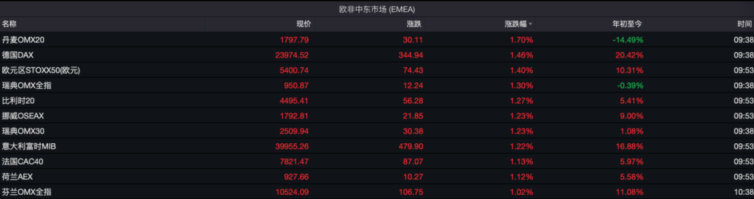 受欧美“关税战”缓和刺激,欧洲多国股市集体大涨,欧洲斯托克50指数、德国DAX指数、法国CAC40指数等均涨超1%,法国汽车零部件供应商股价全线走强。消息面上,美国总统特朗普表示,同意将对欧盟征收50%关税的最后期限延长至7月9日。