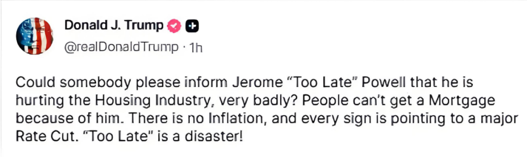 特朗普在“真实社交”上发文称:“谁能告诉‘太迟先生’杰罗姆·鲍威尔,他正在严重伤害房地产行业?因为他,人们无法获得抵押贷款。通货膨胀没有出现,所有迹象都表明利率应该大幅下降。”