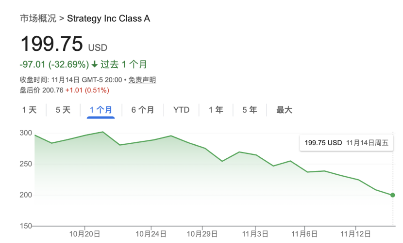 与此同时,“炒币”的美股上市公司也遭遇猛烈抛售。美东时间11月14日,全球最大的“比特币财库”公司MicroStrategy(MSTR)股价大跌超4%,过去一个月的累计跌幅扩大至32.69%。
