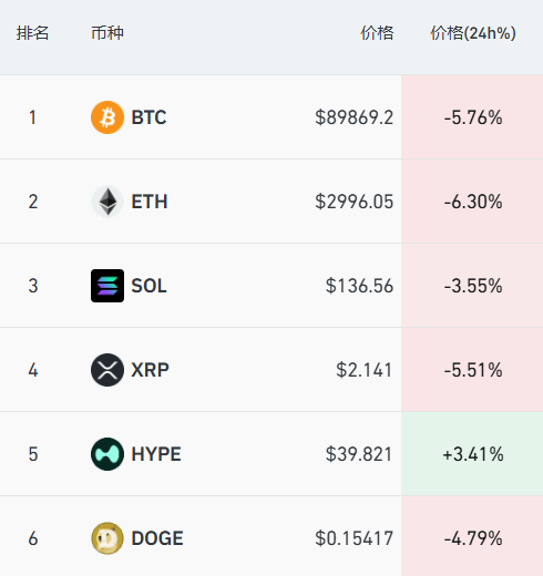 比特币跌破9万美元,以太坊跌超6%,狗狗币跌超4%,过去24小时,全市场超18万人爆仓。