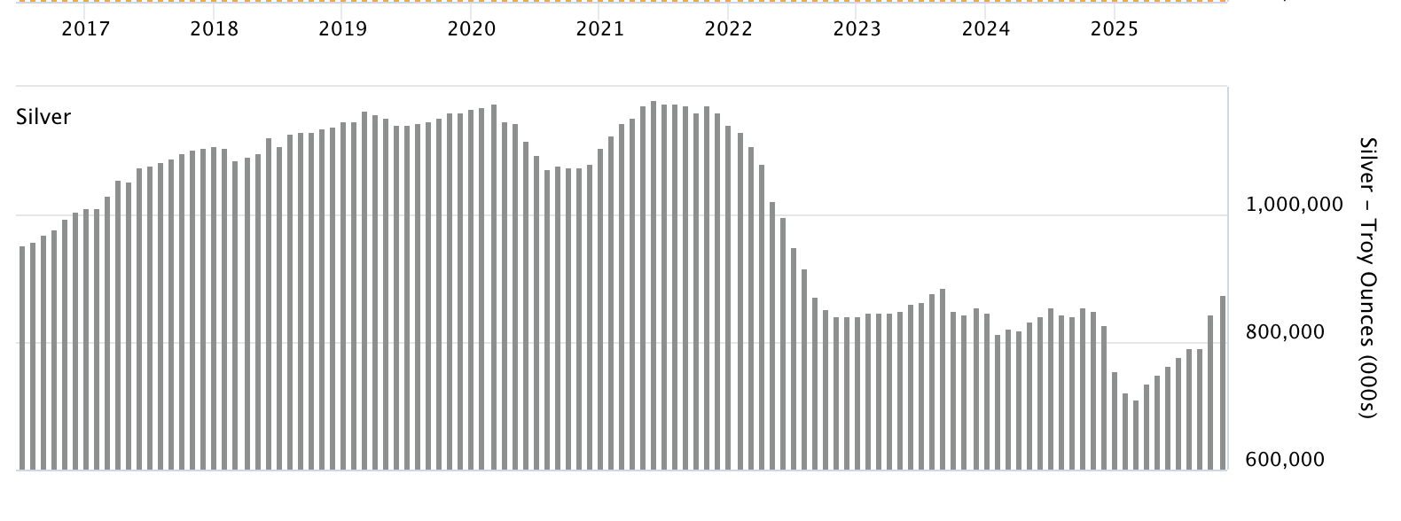 LBMA数据显示,截至11月底,白银库存为8.74亿盎司,较上半年的低点7.11亿盎司有所增加,但整体仍处于近年来的低位。